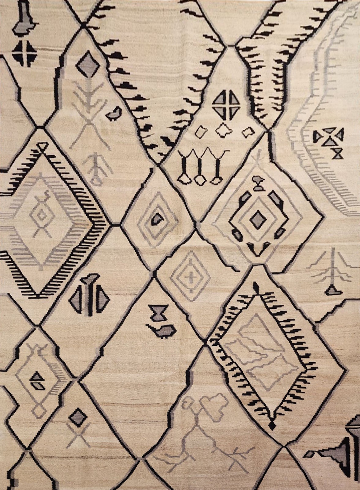 Tissé main,tapis ras, sans velours, en pure laine.
